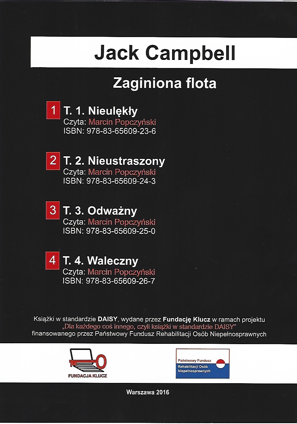Zaginiona flota / Jack Campbell. - Warszawa : Fundacja Klucz, 2016. - 2 płyty audio (CD) (9 godz. 37 min, 10 godz. 58 min ; 11 godz. 9 min, 11 godz. 2 min) : zapis cyfrowy, stereo. ; 12 cm.